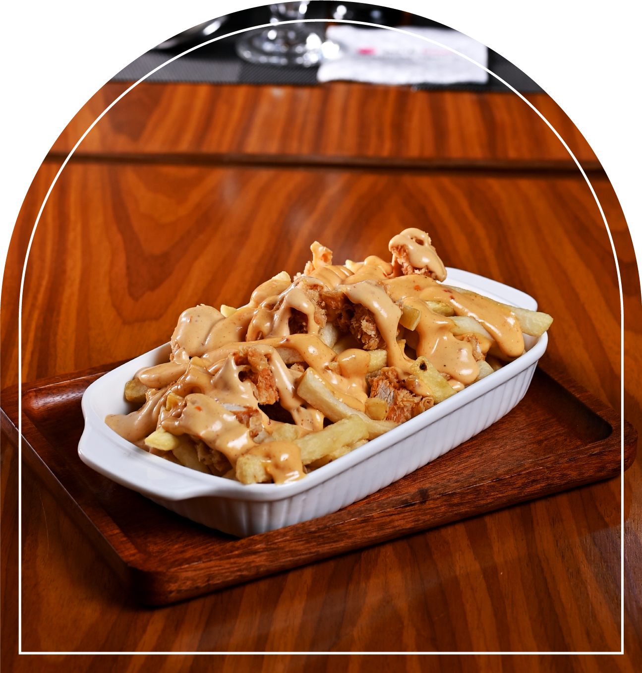 Crispy chicken chunks layered over golden fries, finished with rich, flavorful