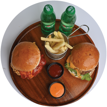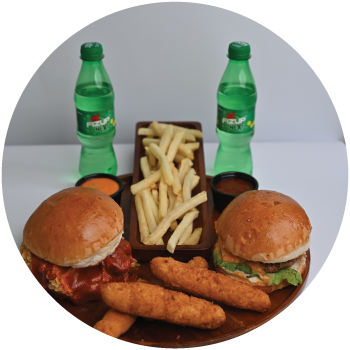 Any two burgers, classic fries, 2 dips & 2 soft drinks. with chicken strip.