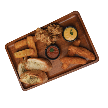 3pc Wings, 3pc Chicken Tenders, 3pc Mozzarella Sticks, 3pc Garlic Bread & 2 Dips.