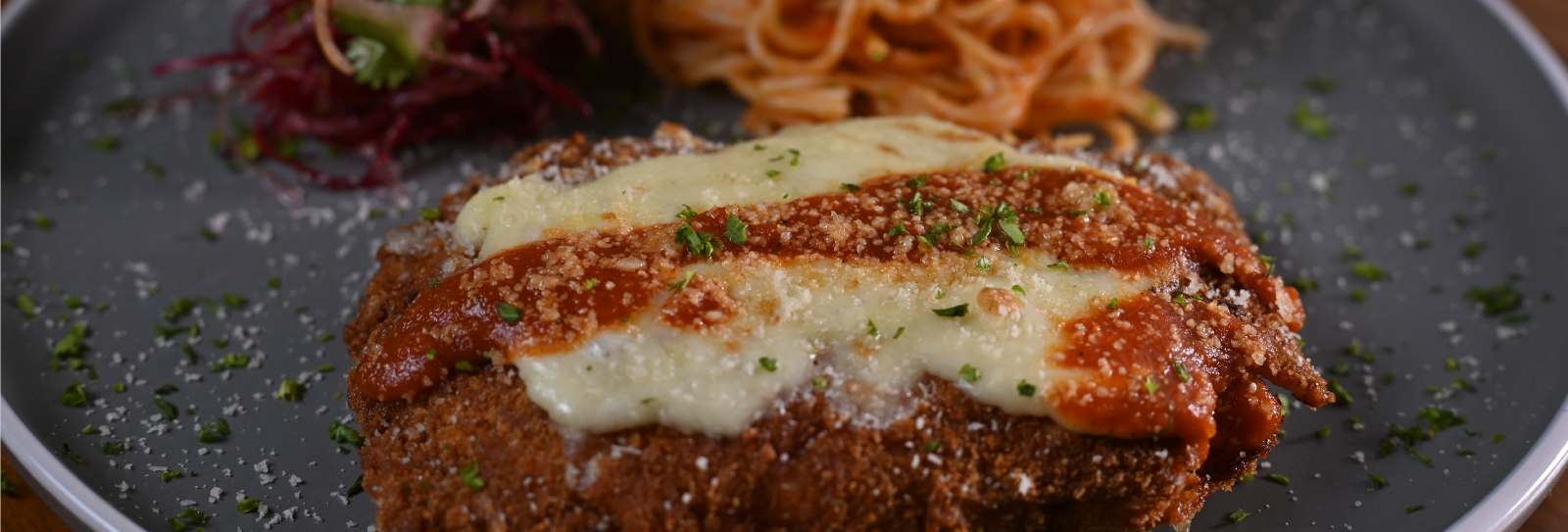 Crispy parmesan-crusted chicken breast topped with creamy garlic-parmesan sauce…