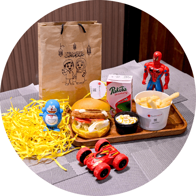 1 Chicken Burger, 1 Pakola juice, 1 Fries, 1 Corn Salsa, 1 Toy Gifts Pack.