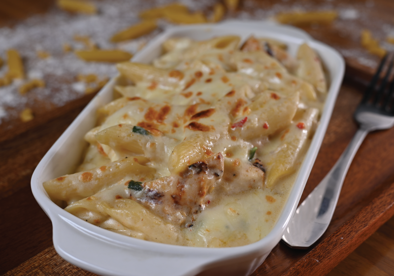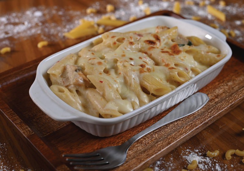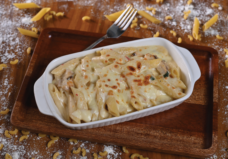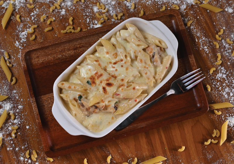 Penne tossed in a silky Alfredo sauce, enriched with Parmesan and butter, and finished with a sprinkle of fresh herbs—a creamy delight in every bite.