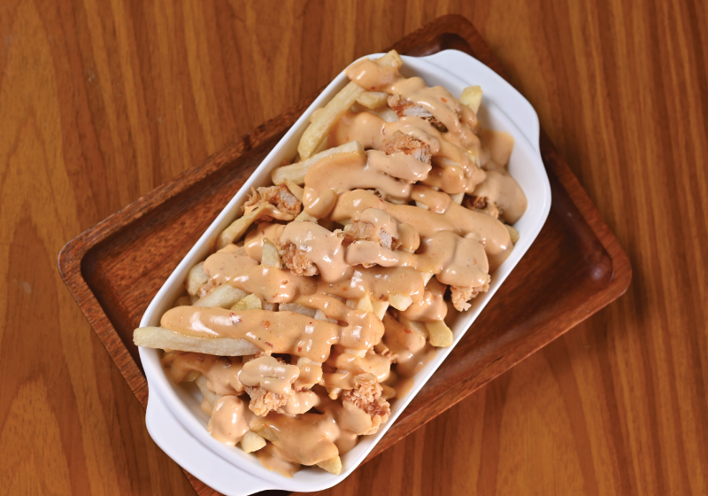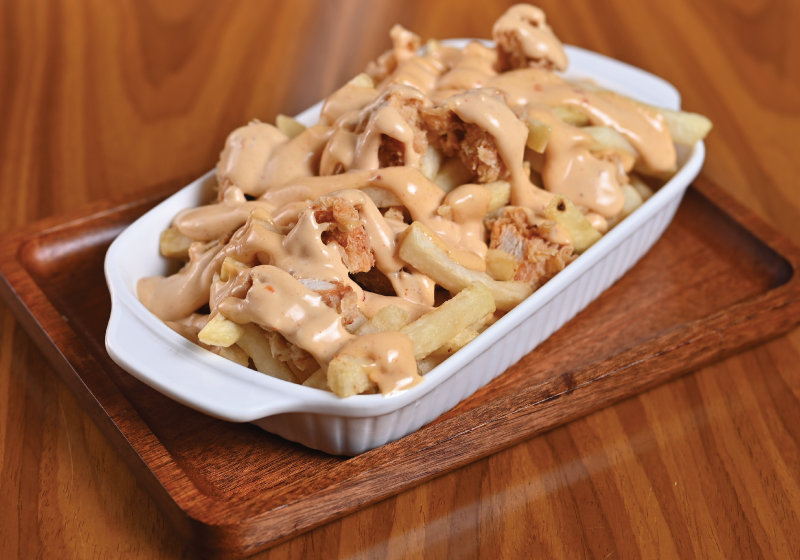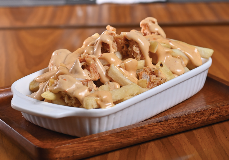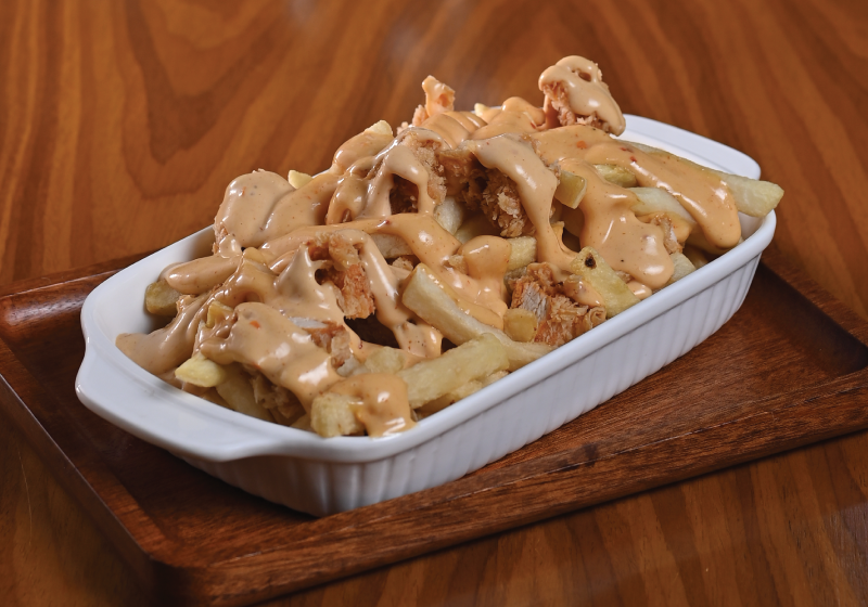 Crispy chicken chunks layered over golden fries, finished with rich, flavorful sauce.