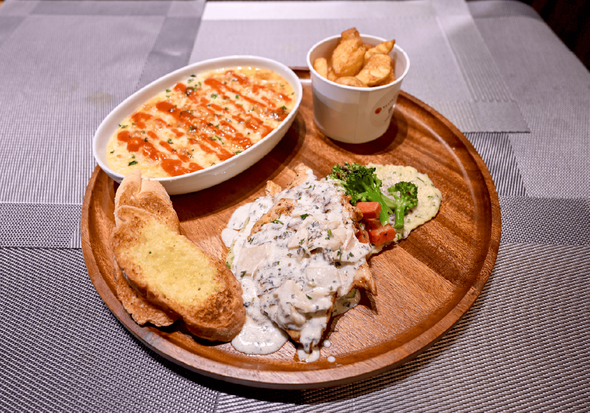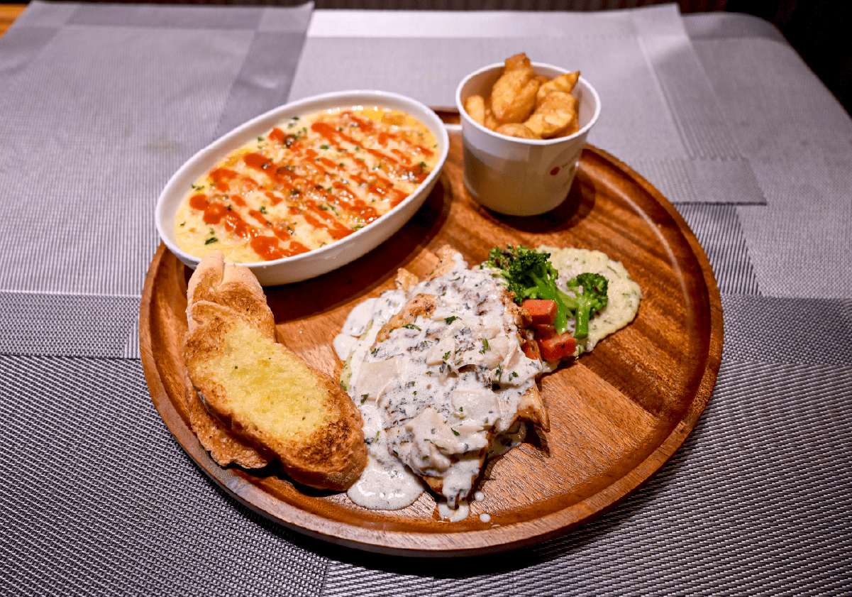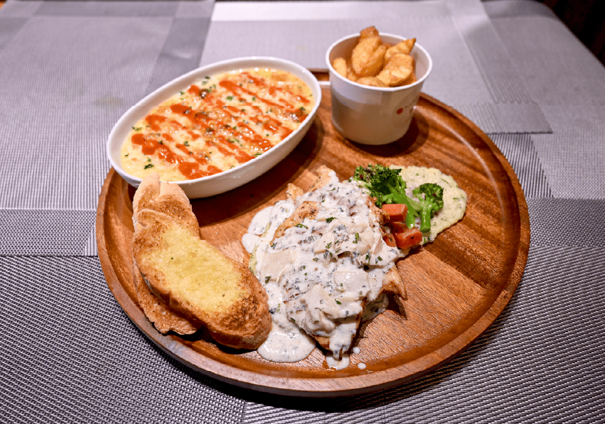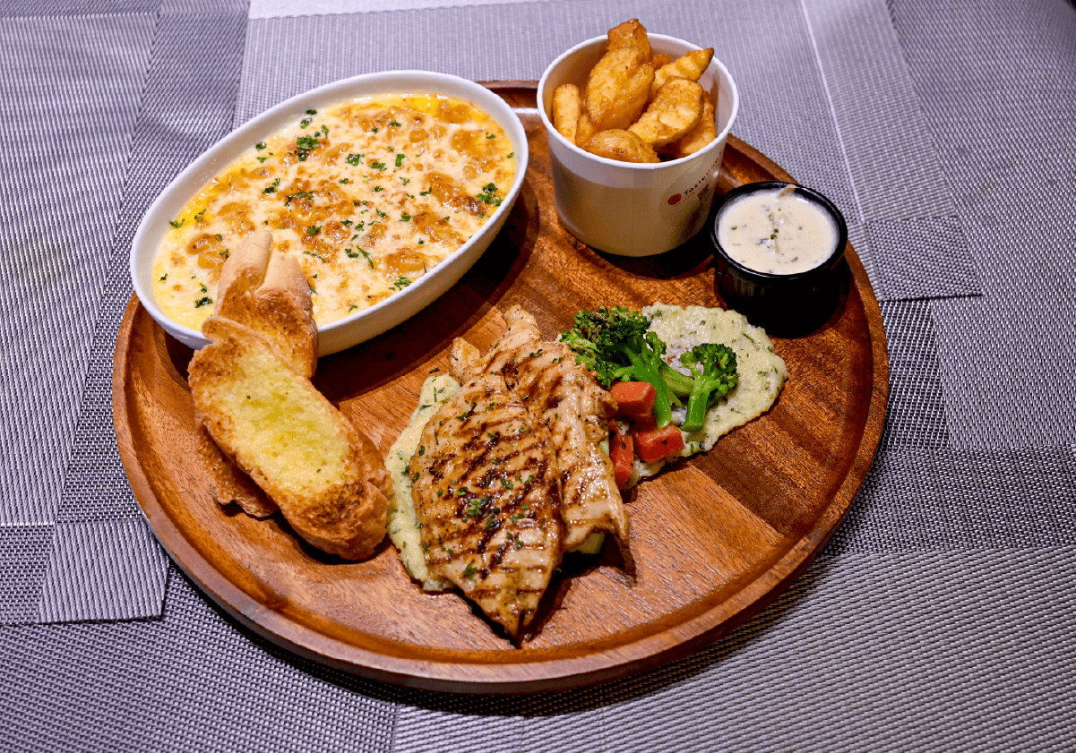 1 Your Choice of Grill Chicken, 1 Your Choice of Pasta, 1 Cajun Potato, 2 Garlic Bread.