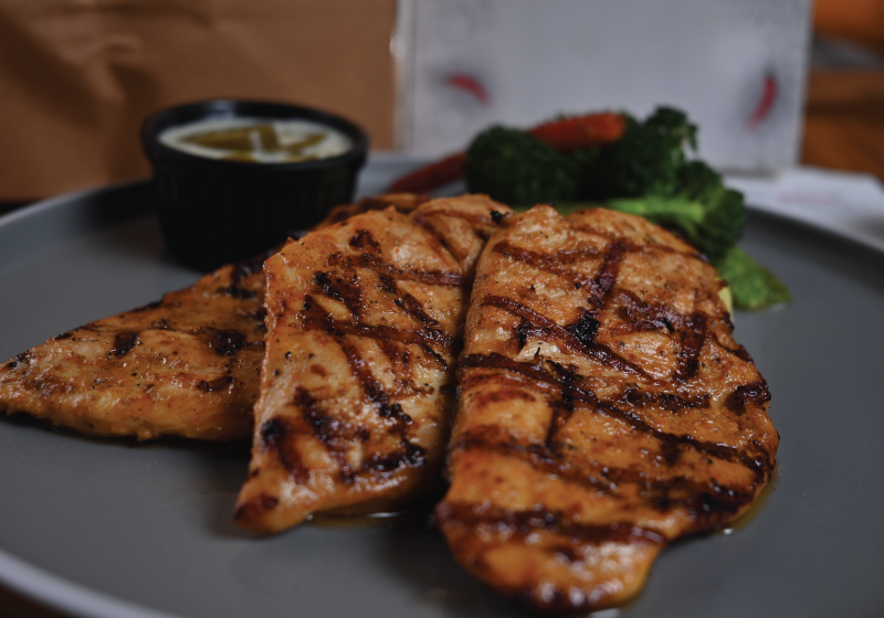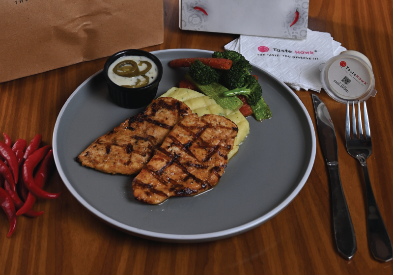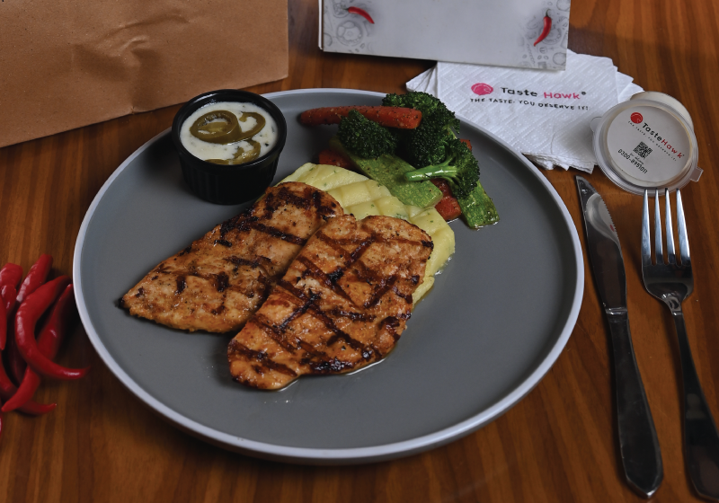 Char-grilled chicken infused with fresh jalapeno flavor, garlic, and herbs, delivering a perfect balance of heat and tenderness, served with side linens.